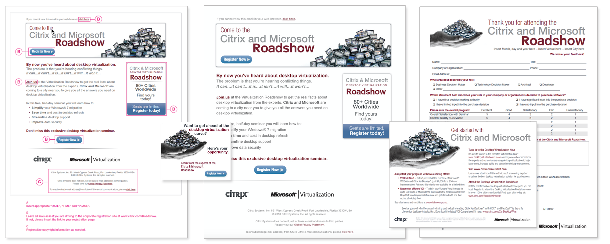 Citrix in collaboration with Microsoft embarked on a year long multi-city roadshow to promote the benefits of desktop virtualization. To support this project many marketing materials needed to be developed. The project entailed working with a program manager and consistenly implementing the roadshow theme across all the promotional materials.